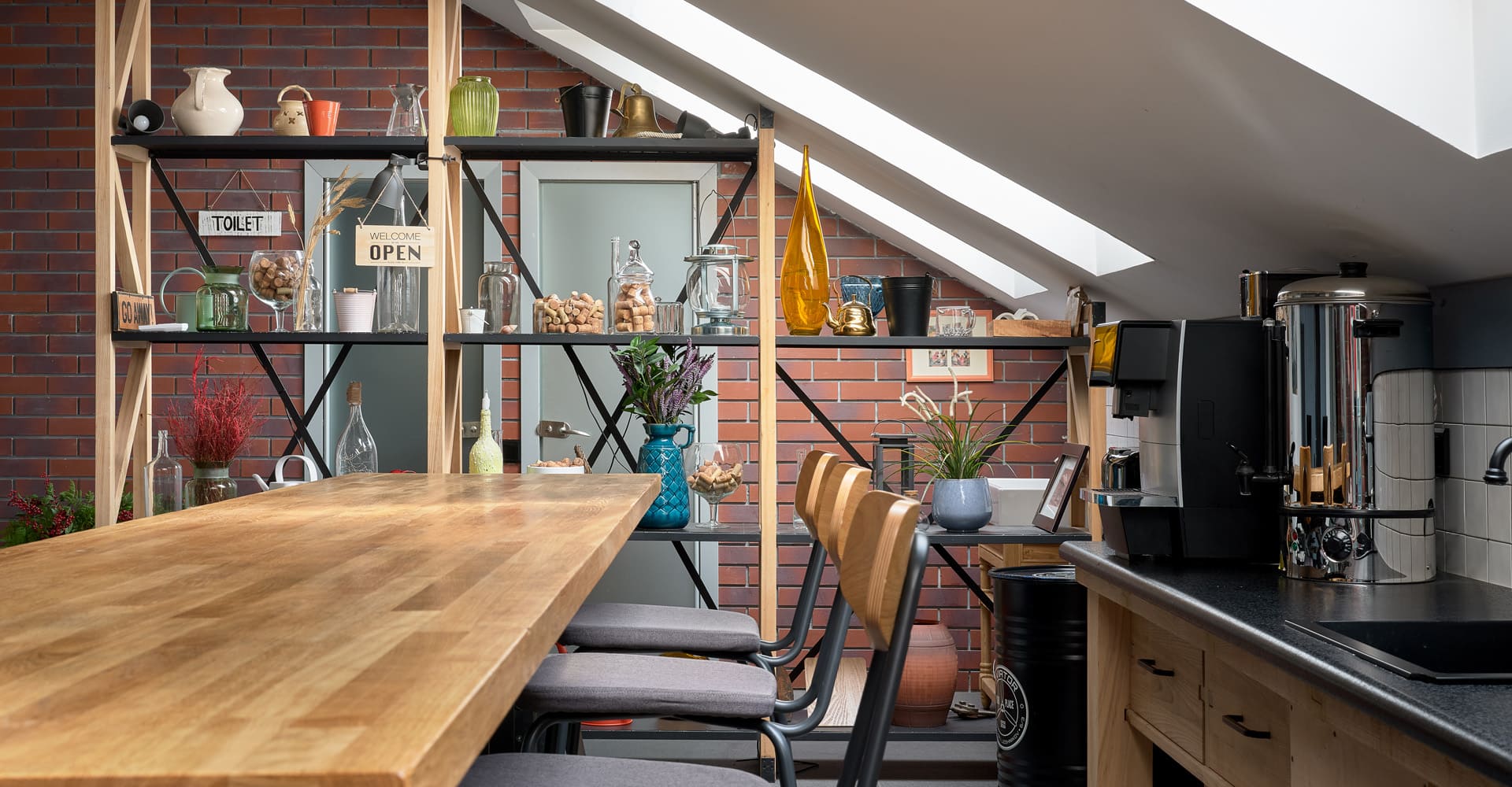 Стены из белого кирпича, мансардные окна, деревянные балки, мягкие диваны вдоль стен, стеллажи с декоративными вещами и многие другие акценты, которые запомнятся вашим гостям.