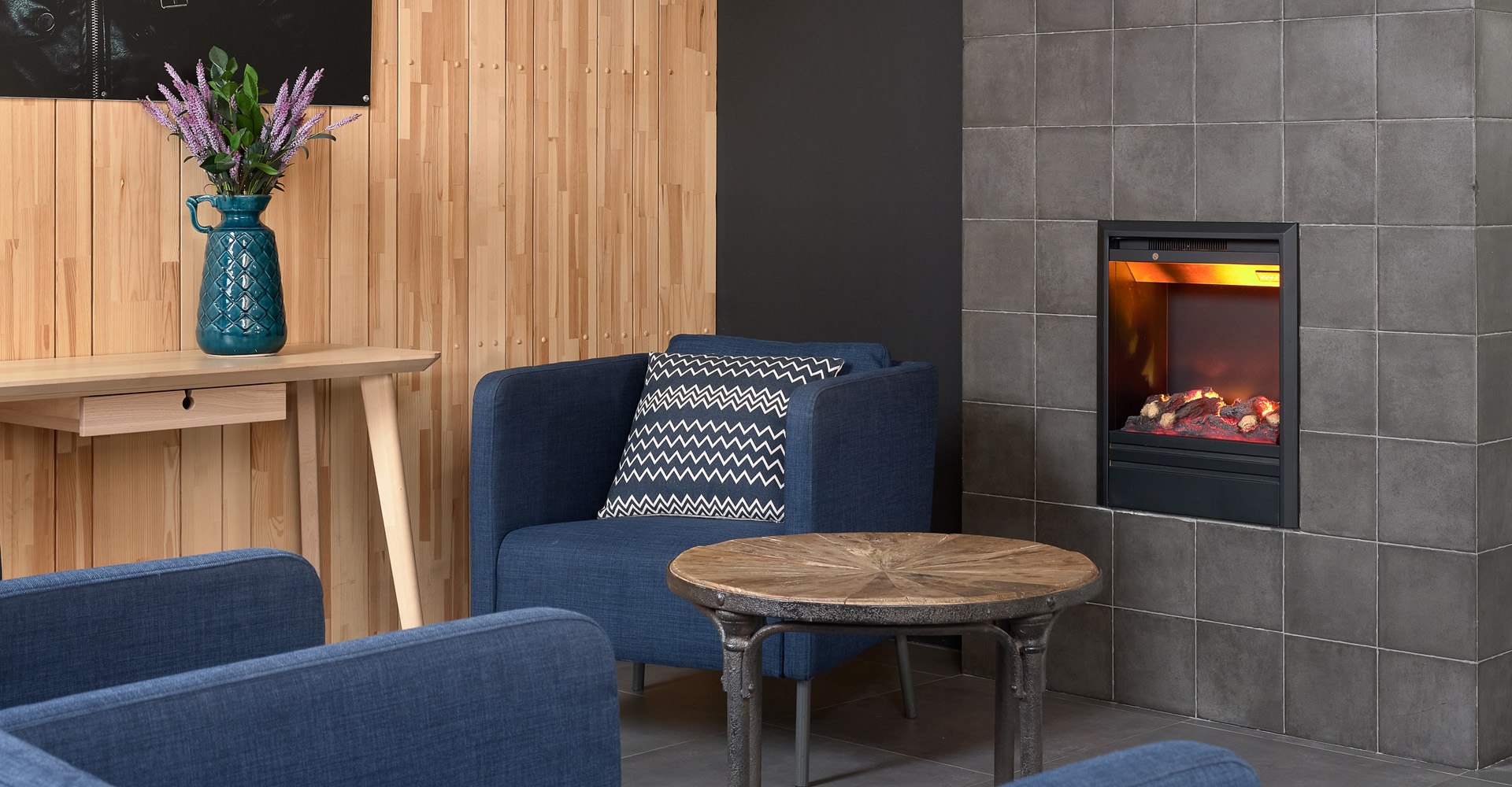 Камин, стена обшитая деревом, мягкие кресла с высокими подлокотниками и подушками — всё это создаёт уютную атмосферу и настраивает на позитивную волну.